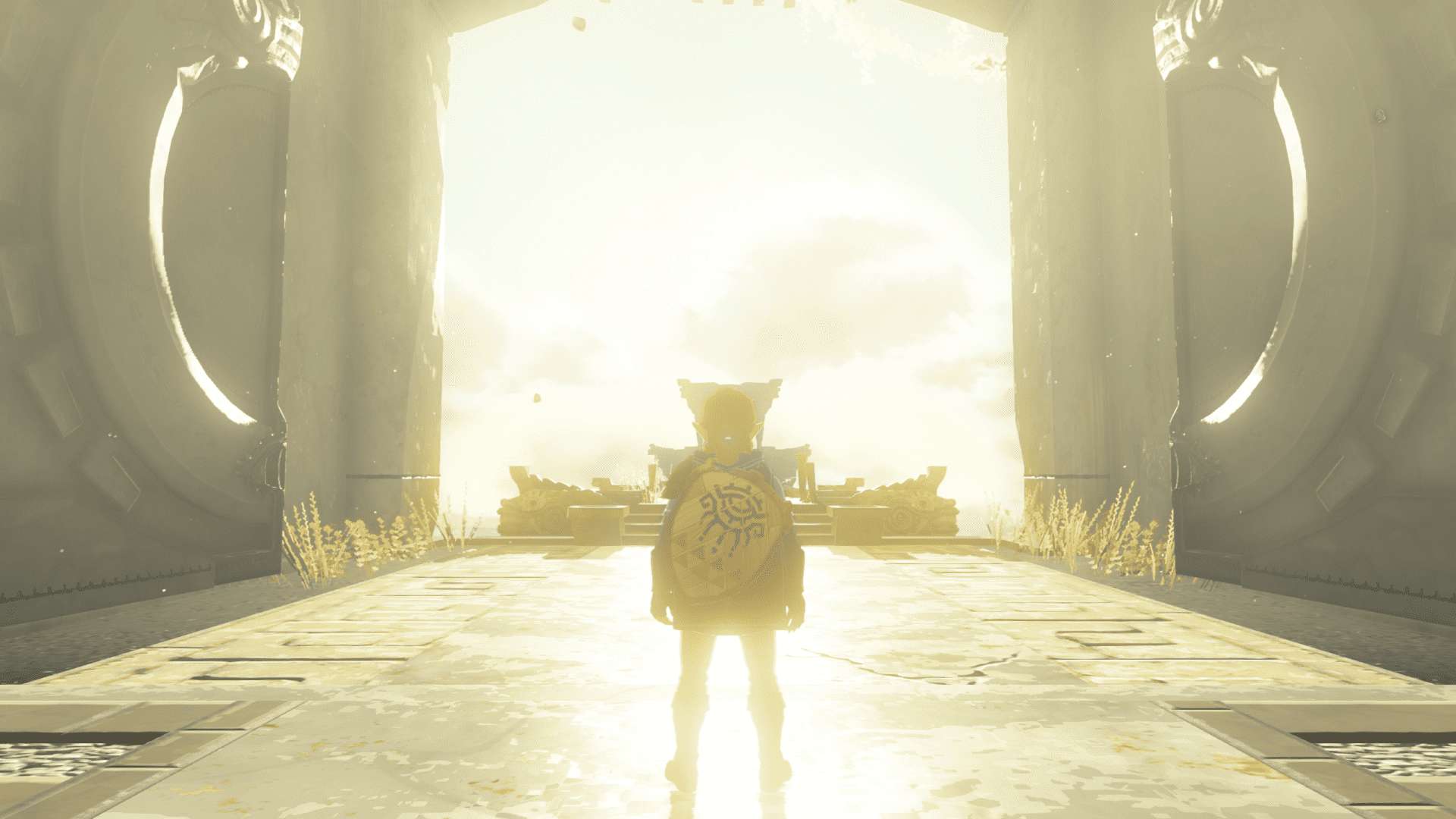 The adventure begins beneath the majestic Hyrule Castle, where Link and Zelda navigate a shadowy tunnel echoing with tension and mystery. As their path unfolds, the pair encounter ancient Zonai carvings – intricate relics of a forgotten civilization. These markings, etched with detail and steeped in legend, foreshadow the deeper mysteries waiting to be uncovered. Zelda’s knowledge of the kingdom’s past lends context, unraveling the myths of the Zonai and their long-lost power, while the game immediately sets the stage with striking visual storytelling and atmospheric design.